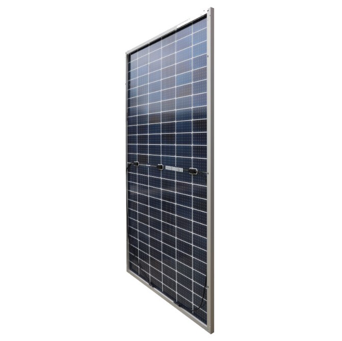 This bifacial PERC module can receive sunlight from the front and back and convert it into electricity. Compared with traditional single-sided modules, double-sided PERC modules can increase power output and improve power generation efficiency. In addition, bifacial modules can also make full use of solar energy resources in environments such as sunlight reflection, scattering, and building reflection.